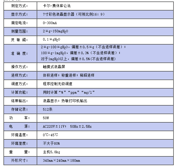 儀器符合GB/T7600及采用卡爾—費(fèi)休法測(cè)定樣品中水分的有關(guān)標(biāo)準(zhǔn), 是淄博庫(kù)侖分析儀器有限公司經(jīng)過幾代庫(kù)侖法微量水分測(cè)定儀的完善和改進(jìn),生產(chǎn)出的全新的具有人機(jī)對(duì)話功能新一代水分測(cè)定儀器。 該儀器采用雙CPU控制,測(cè)量精度、運(yùn)算功能大幅度提高,同時(shí),大屏幕彩色液晶顯示、觸摸屏控制、中文菜單,具有電極開路、短路報(bào)警等故障自檢功能,可儲(chǔ)存512條信息,自動(dòng)計(jì)算并打印PPm、%、mg/L的測(cè)定結(jié)果。該儀器獲得三項(xiàng)國(guó)家專利。