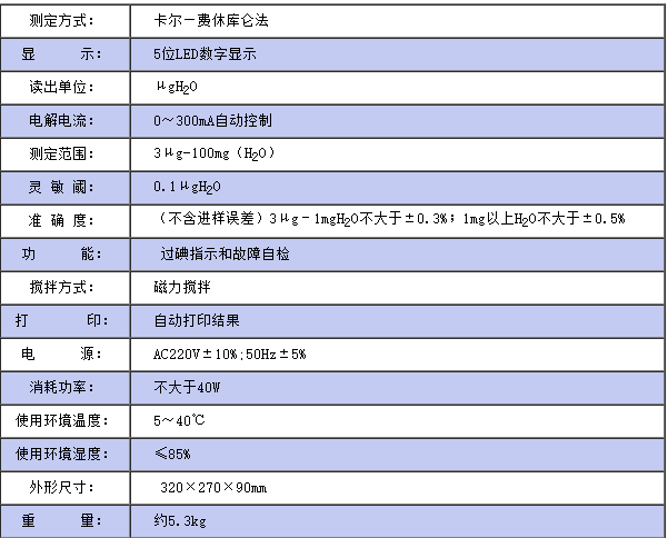 儀器符合GB/T7600;SH/T0246;GB/T606及采用卡爾—費(fèi)休法測定樣品中水分的有關(guān)標(biāo)準(zhǔn),儀器采用了先進(jìn)的自動控制電路,電解電流自動跟蹤控制,外型結(jié)構(gòu)新穎,從而使該儀器工作更可靠,使用更方便,具有分析速度快(一分鐘出結(jié)果)、操作簡便、精度高、自動性強(qiáng)等特點(diǎn),同時具有自動打印功能,可將實(shí)驗(yàn)結(jié)果、做樣時間、樣品編號自動打印出來,廣泛應(yīng)用于石油、化工、電力、鐵路、環(huán)保等部門。