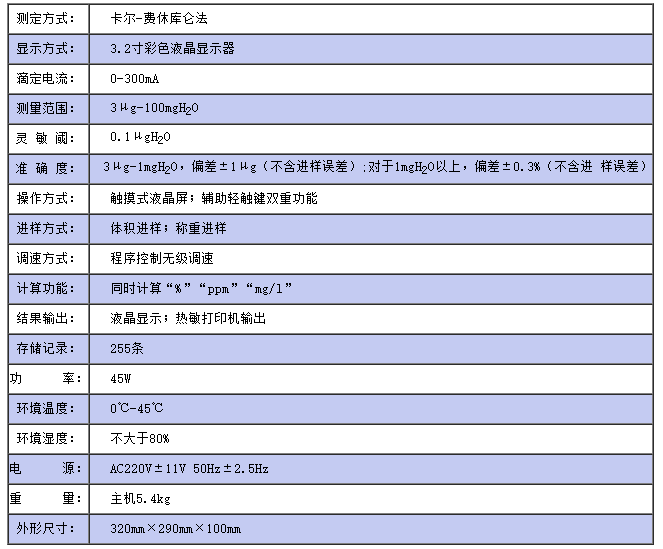 儀器符合GB/T7600及采用卡爾—費休法測定樣品中水分的有關(guān)標準, 是采用先進技術(shù)研發(fā)的,全新的具有人機對話功能新一代水分測定儀器。該儀器采用了雙CPU控制、彩色液晶顯示、觸摸屏控制、中文菜單,具有電極開路、短路報警等故障自檢功能,可儲存255條信息,具有自動計算百分含量、PPM值、自動打印功能。